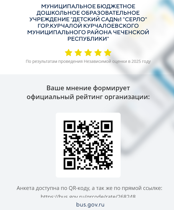 Наименование учреждения: Муниципальное бюджетное дошкольное образовательное учреждение «Детский сад №1 "Серло"  г. Курчалой Курчалоевского района"