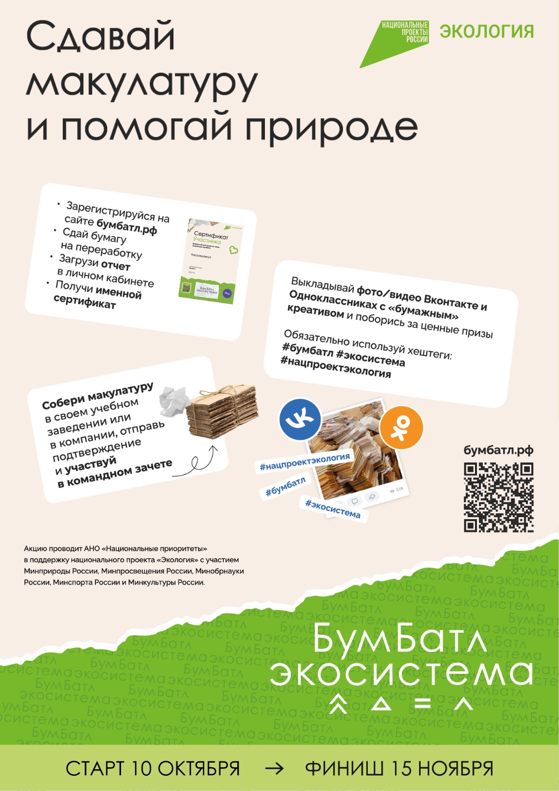 Акция «БумБатл»проходит в поддержку национального проекта «Экология» при участии Минприроды России, Минпросвещения России, Минобрнауки России, МинкультурыРоссии и Минспорта России.Экологический партнер акции – ППК «Российский экологический оператор».